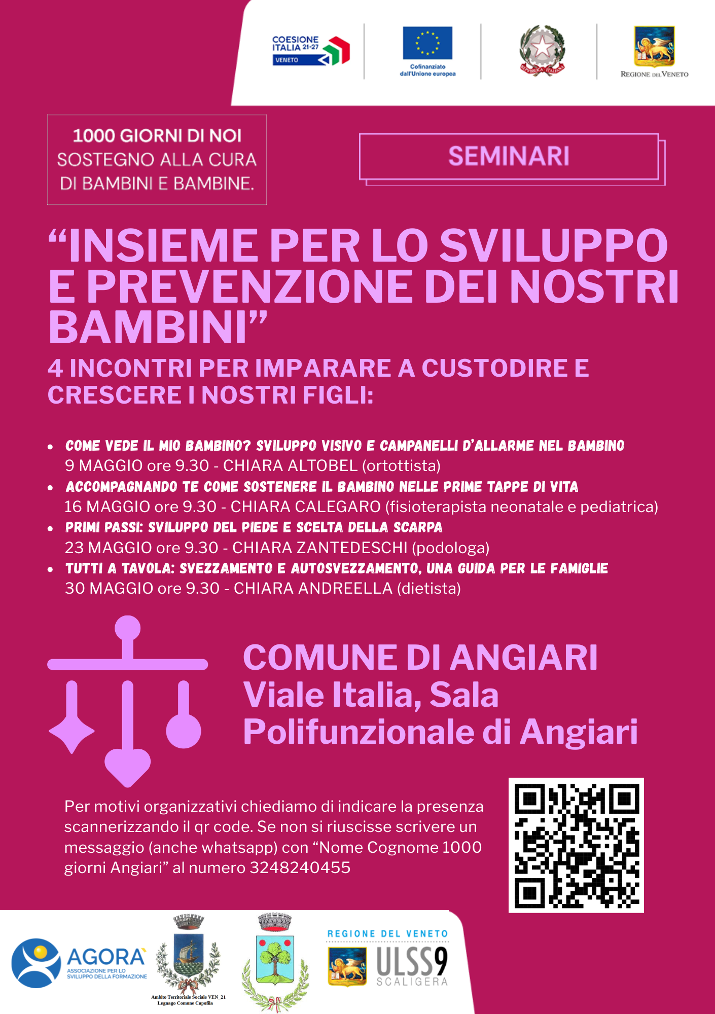 Per motivi organizzativi chiediamo di indicare la presenza scannerizzando il qr code presente nella locandina. Se non si riuscisse scrivere un messaggio (anche whatsapp) con “Nome Cognome 1000 giorni Angiari” al numero 3248240455